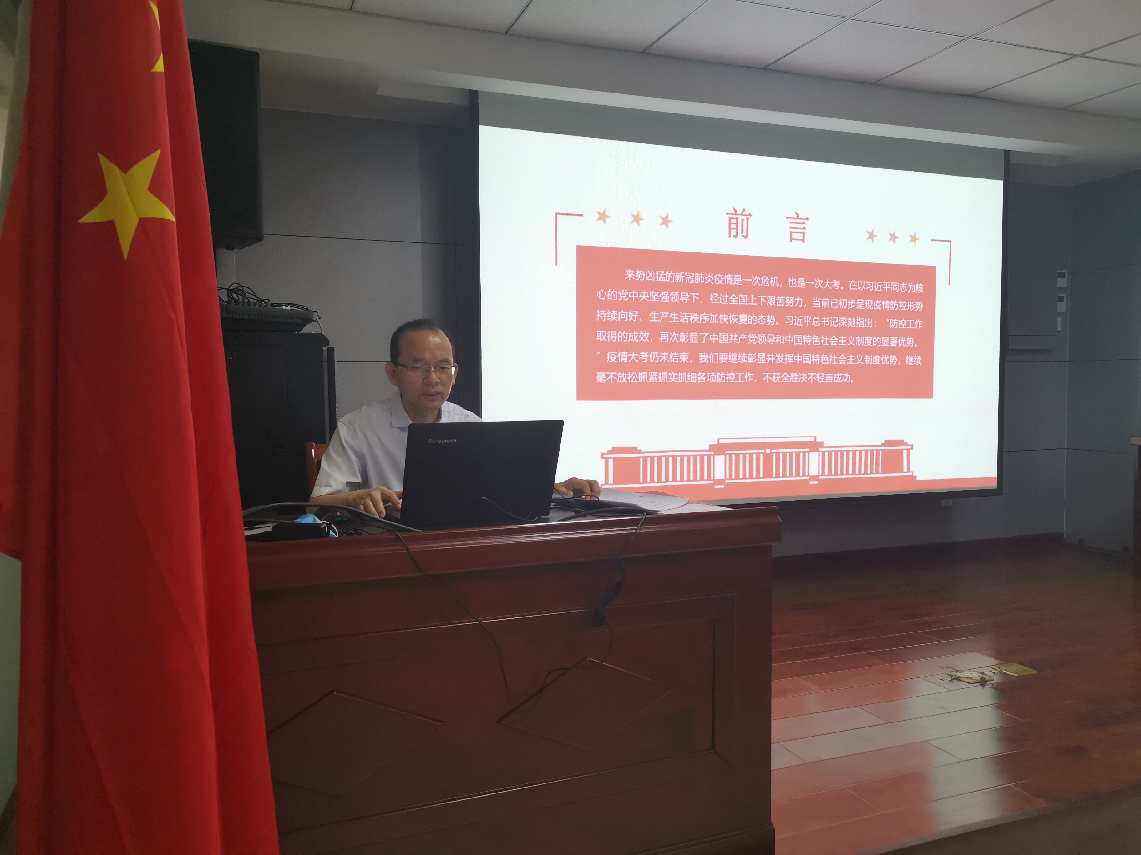 2020年7月2日上午,中共承德市國控投資集團有限責(zé)任公司第二支部委員會支部書記焦俊良同志以“在大考中彰顯中國特色社會主義制度優(yōu)勢”為題,為全體支部黨員和入黨積極分子上了一堂別開生面的黨課。