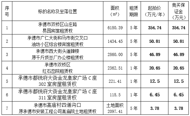 我集團(tuán)全資子公司承德市國控資產(chǎn)運(yùn)營有限公司、承德市國瑞物業(yè)管理有限公司委托河北福成拍賣有限公司,定于2020年1月21日上午9時(shí)在承德市雙橋區(qū)武烈路6號紫御國際假日酒店會議室公開拍賣下列標(biāo)的,現(xiàn)將有關(guān)事項(xiàng)公告如下: